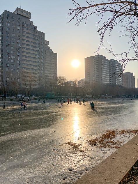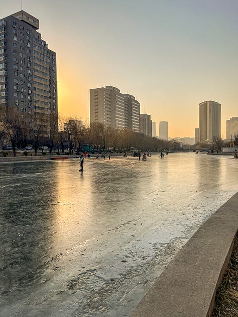It turned out that our first winter in Beijing had been their coldest on record. Which makes sense, I suppose, because the Liangma had frozen over and was solid enough for folks to spend afternoons ice skating on it. Parents skated, pulling kids in small saucer-type sleds. Young girls practicing their jumps and twists, dreaming of Olympic gold. And others simply sliding around because they could.